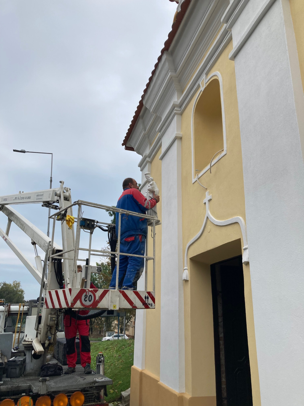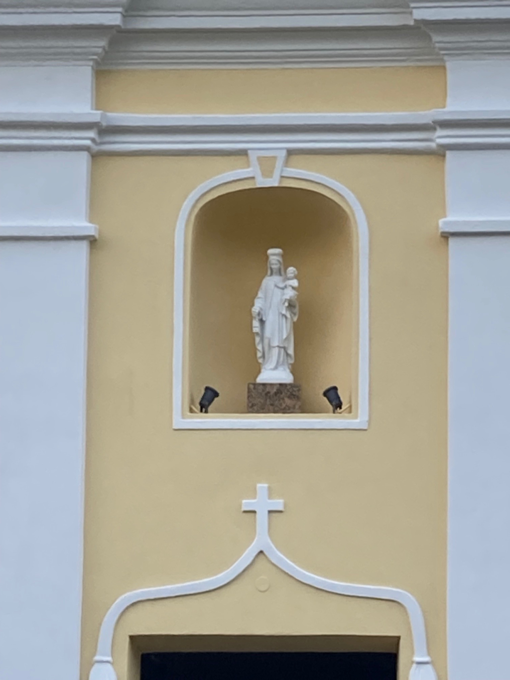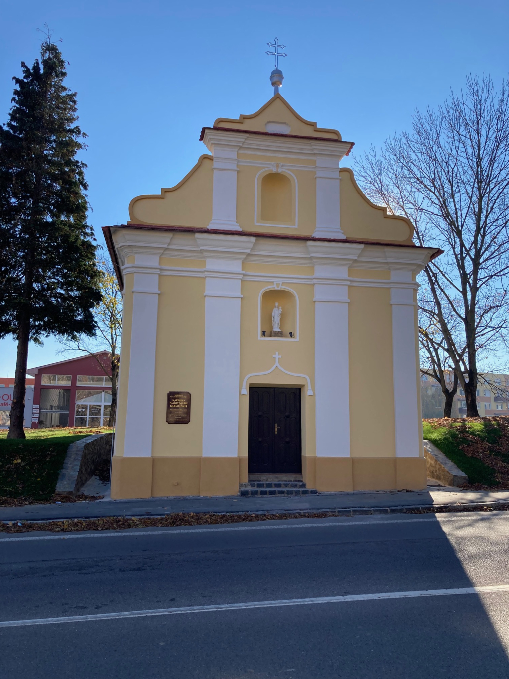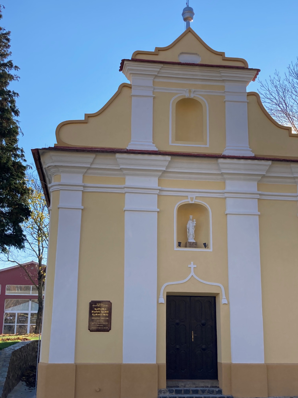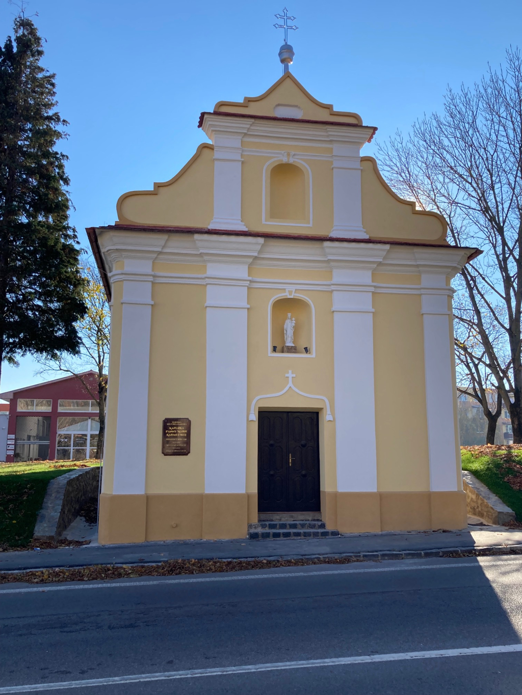Na Ružencovú Pannu Máriu (7.10.2021) sa na priečelie do výklenku nad vchodom do kaplnky umiestnila socha Karmelskej (Škapuliarskej) Panny Márie, ktorej kaplnka je od roku 1750 zasvätená. Socha sa kúpila a doviezla z Talianska a je vyrobená z umelého kararskeho mramoru. Chceli sme aj vyššiu alebo farebnejšiu sochu takejto Panny Márie, ale vyššiu sochu vhodnú umiestnenia do exteriéru sme nezohnali. V nočných hodinách bude táto socha osvetlená.