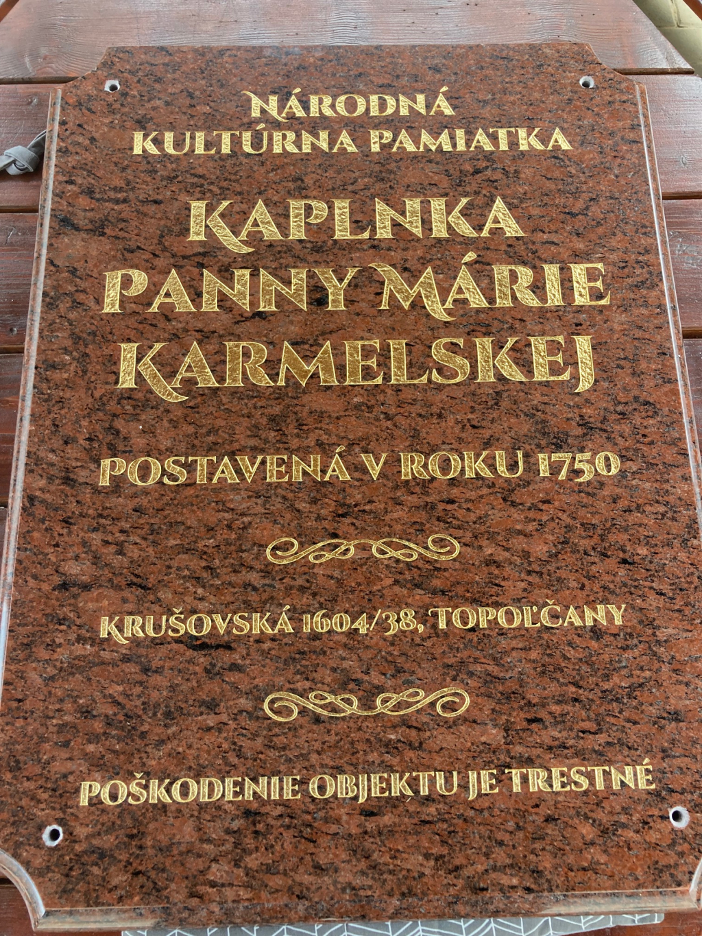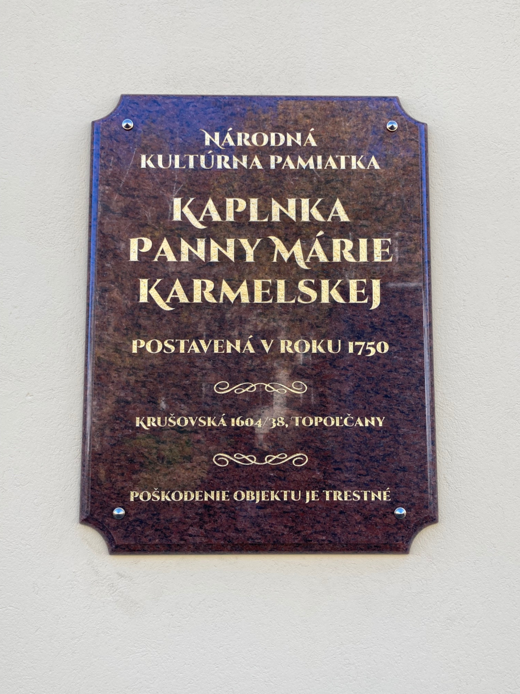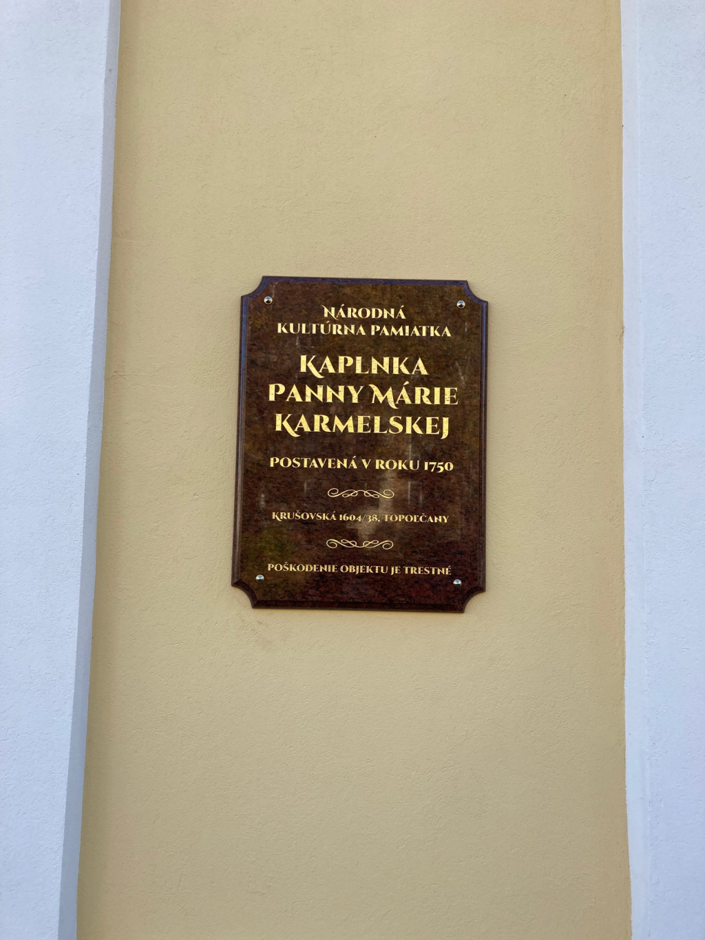 Nech obnovený vonkajšok kaplnky slúži na väčšiu česť a slávu Božiu, k úcte Panny Márie Karmelskej a k skrášleniu lokality širšieho centra Topoľčian. (DA)
