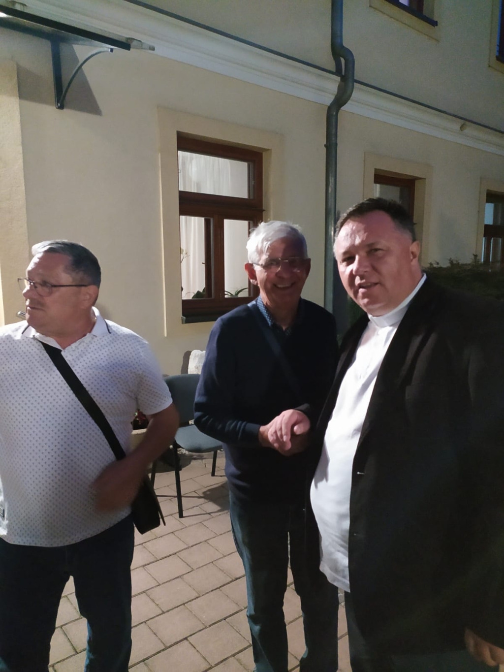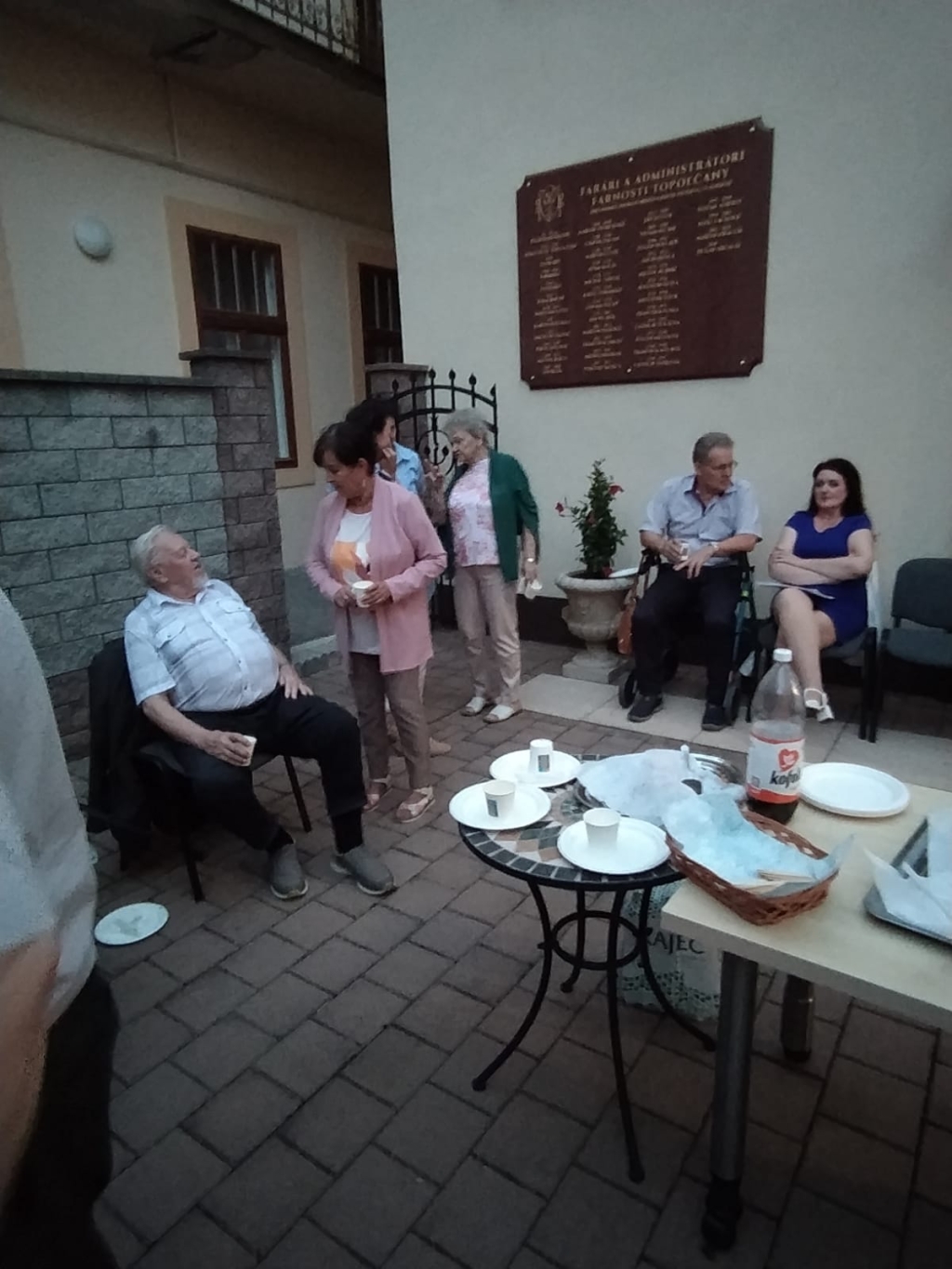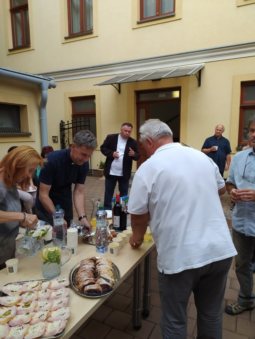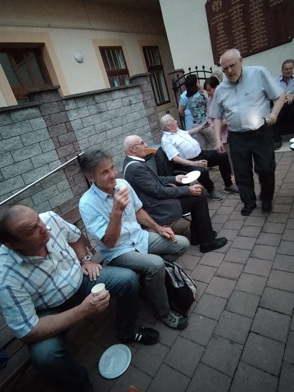 Po skončení večernej bohoslužby nasledovalo v daný deň ešte vo vnútornom farskom nádvorí príjemné stretnutie so spevákmi a hudobníkmi nášho chrámového spevokolu. Bola to jedinečná príležitosť všetkým členom zboru na čele s našim regenschorim vyjadriť vrelé poďakovanie za ich spevy počas našich slávností, kedy umocňujú vznešenosť a krásu liturgie. Zároveň im bol predstavený náš nový farský vikár - kaplán dp. Július Nemček.