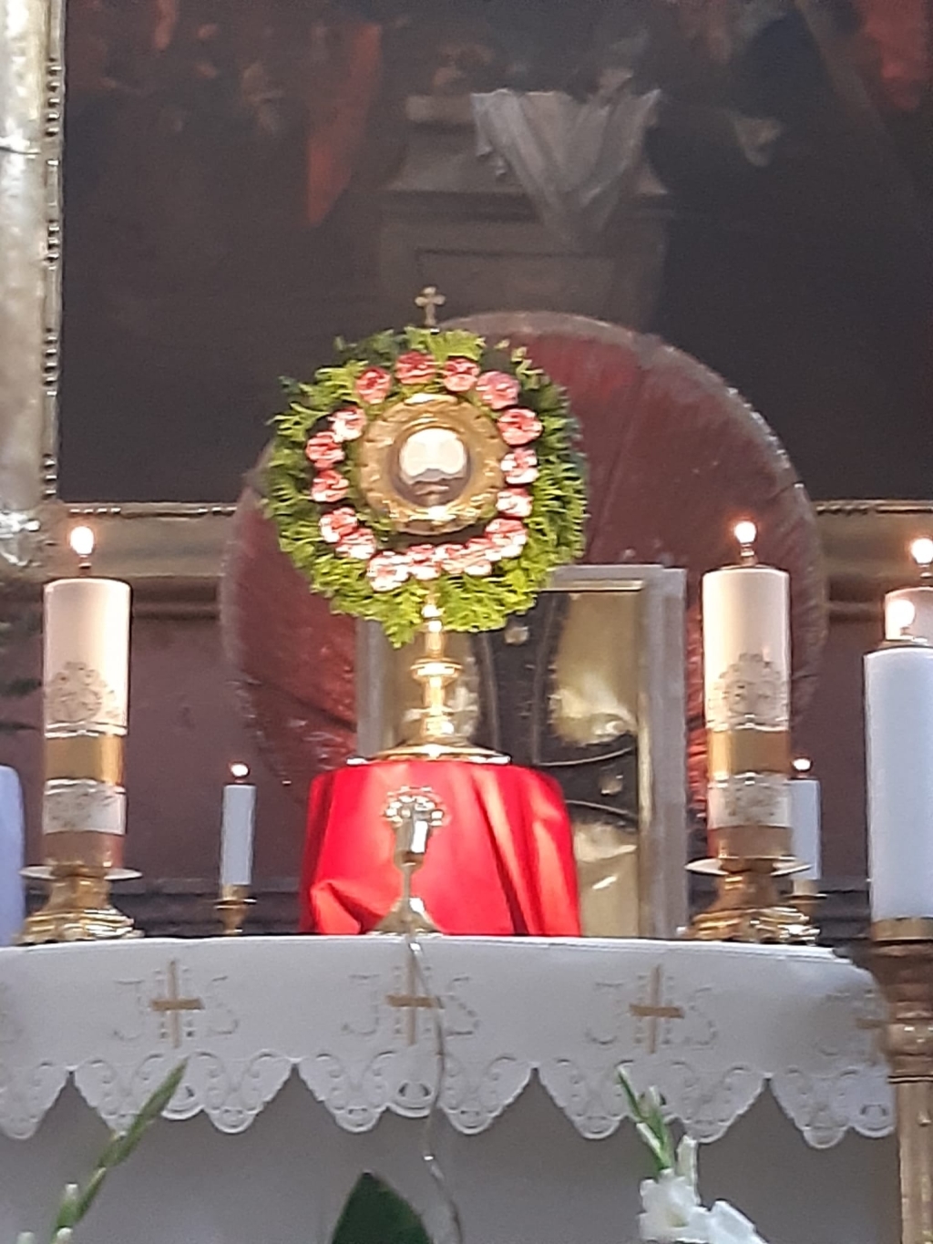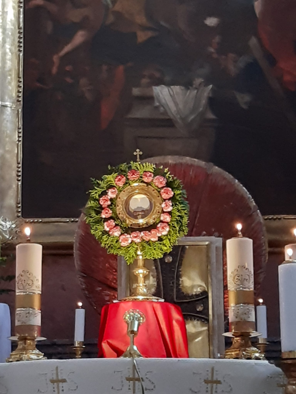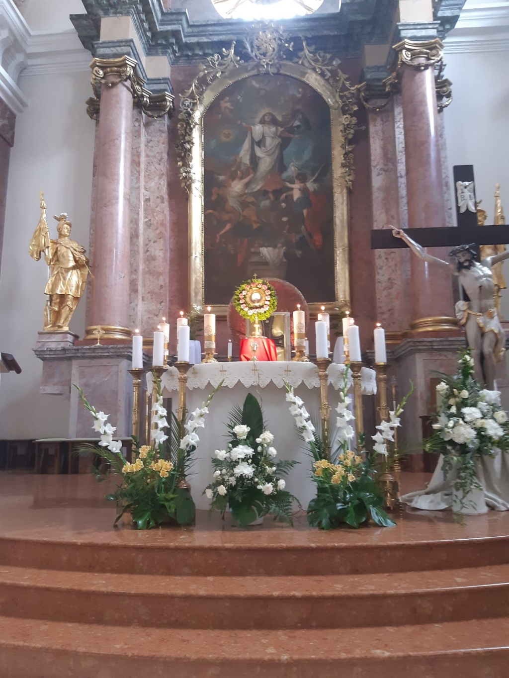 Každá farnosť v diecéze má určený niektorý deň v kalendárnom roku, kedy sa v jej farskom kostole má konať Deň farskej poklony. Naša Farnosť má každoročne predpísaný deň, ktorým je 4. júl. Takto aj tohto roku 2024 sme pripravili slávnostnejšiu formu farskej poklony, hoci zhodou okolností to tento rok bolo práve vo štvrtok, kedy každý týždeň máme vo štvrtok celodennú poklonu. Predsa len, slávnostnejšia forma zvýraznila tento adoračný okamih. Dvanásť sviec - ako bolo apoštolov, horelo okolo obetného stola, kde bola farebnými kvetmi prizdobená monštrancia, ktorá uchováva ten najvzácnejší náš poklad a bohatstvo, ktorým je sviatostný Kristus Pán prítomný v Eucharistii. Veriaci počas celého dňa vstupovali do chrámu, aby Pánovi predkladali svoje modlitby, prosby, vďakyvzdania i odprosenia a všetky ich úmysly, ktoré obopínajú ich myseľ a srdce. To bolo v závere celodennej adorácie predložené aj v záverečnej pobožnosti pred večernou bohoslužbou.